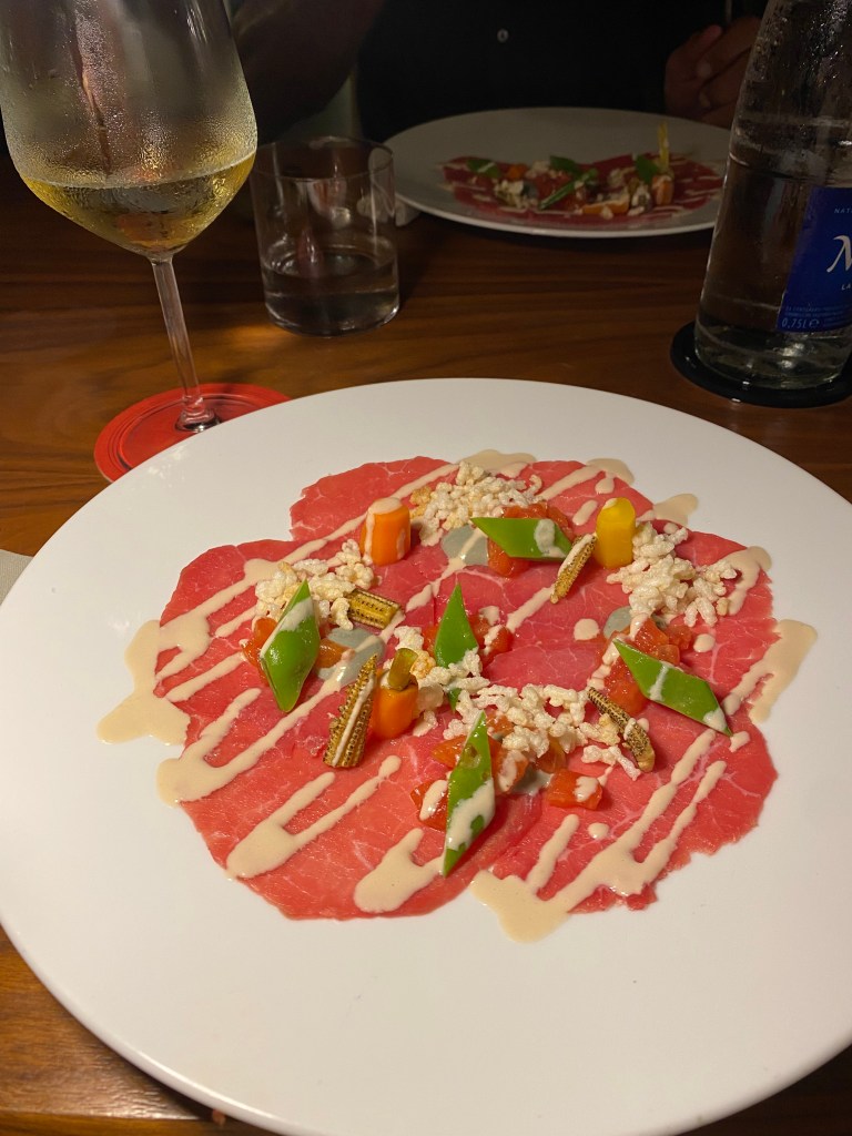 Sale in cattedra, questa volta con decisione, chef Davide Cannavale con il Carpaccio di manzo con reinterpretazione di riso all’insalata. Un mix di note dolci affumicate ed erborinate. Si assapora sempre un’idea, un concetto, un’identità. Una cucina che si mette in discussione continuamente volta a maritare stupore ed eleganza e a esaltare la materia prima.