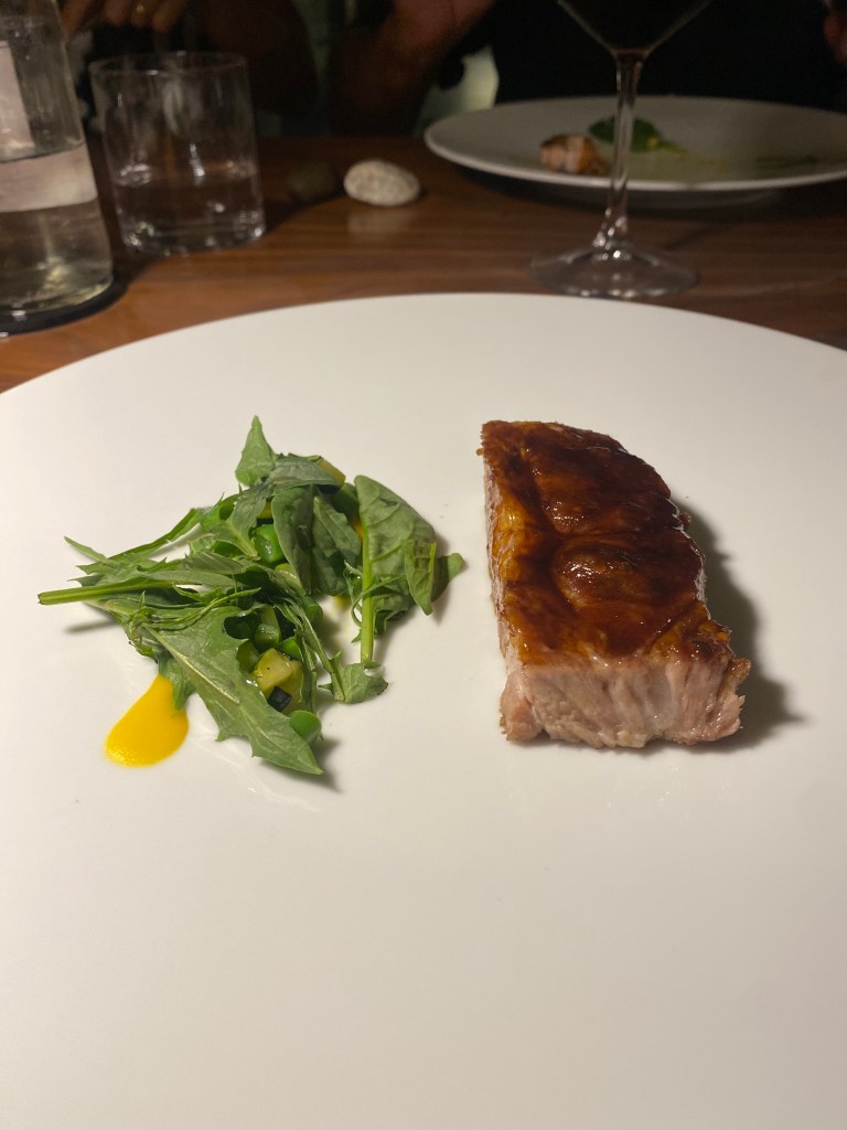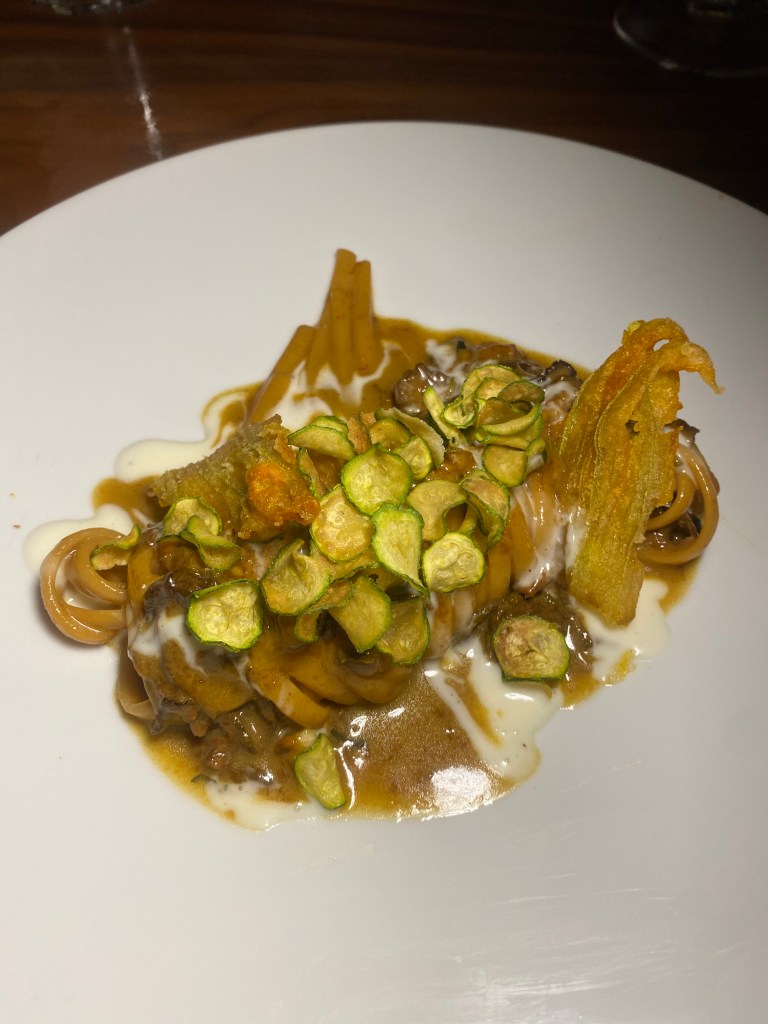 Le Linguine alla Nerano sottolineano uno slancio inaspettato tra dolcezza, cremosità e umami. Il Maialino con caponata e verdure green si fa piatto emozionale, dove consistenze e sapori si abbracciano in una danza lunghissima.