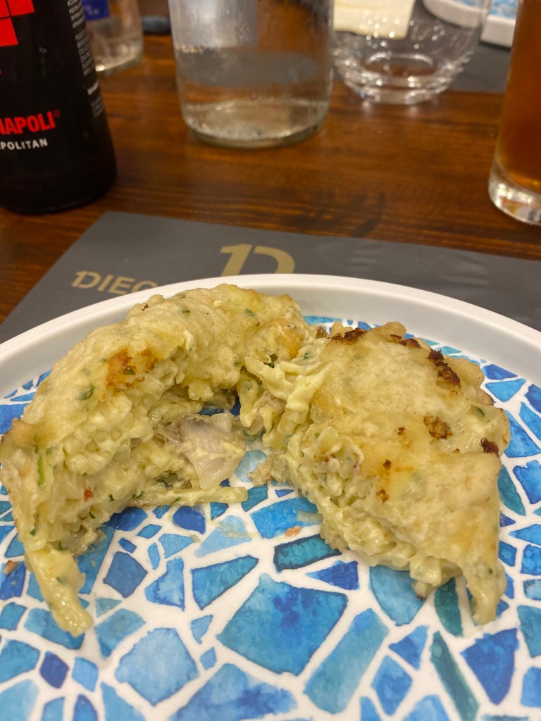 Frittatina fatale. Aglio e olio e vongole. La scorza croccante cede il posto all’umami marino del mollusco. Cremosità e delicatezza iodata. Statuto ontologico del vivere partenopeo. Vacillare.