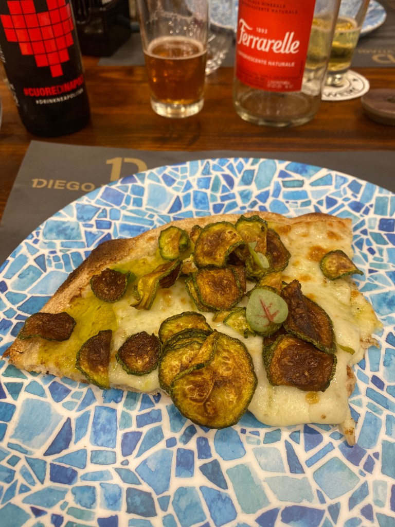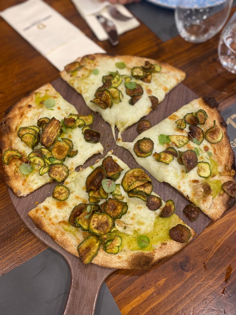 Intermezzi classicheggianti su basi pop. Rustichella super crock, idratazione 1 a 1, con dinamiche bucoliche. Dal sole alla Terra dei fiori, lo stile che resta. Cremoso di zucchine che diluisce, chips delle stesse che solleticano, provola e fiori di fragole. Sapori netti, nitidi e il morso che stimola quello successivo. Green Park.