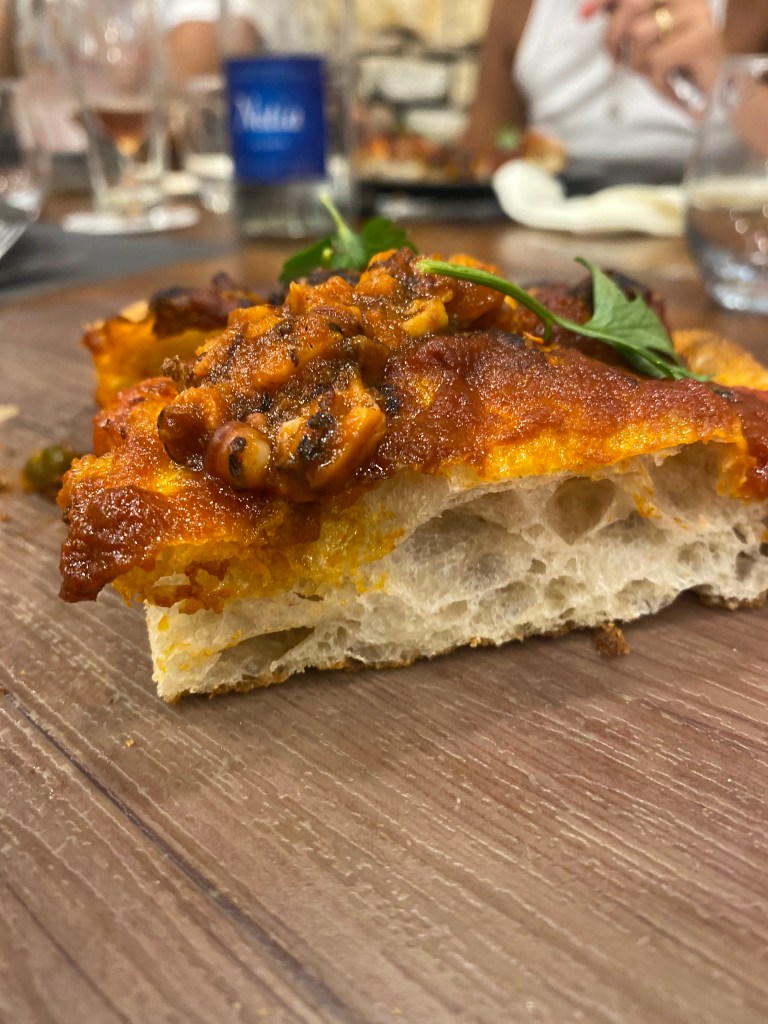 D’un tratto l’Idilio: Sua Maestà la Croccante incontra i fondali salmastri. La magia di una consistenza morbida dalla superficie crunch che si abbandona all’abisso della scarpetta terapia. Pomodoro, peperoncino, capperi, prezzemolo e tartare di polpo alla Luciana. Sindrome di Stendhal. Polpo & Fiamme che tentacolano l’anima. Di una vanità e piacioneria che non offusca tecnica e identità. Momenti di défaillance.