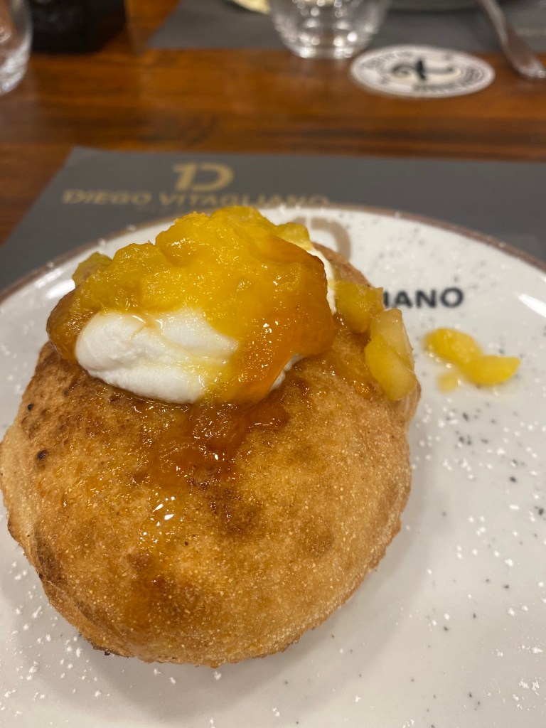 Speciale come le cene che finiscono a pizza fritta. Caramella alla frutta, fritta e al forno dolce con prugne caramellate e fresche con ricotta di pecora in purezza. Per chi cerca fuochi d’artificio.