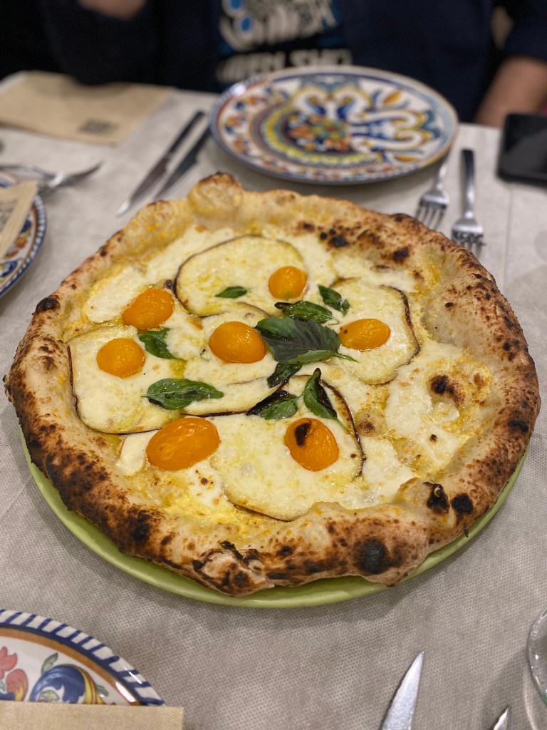 Di una eleganza travolgente la dedica al Museo d’arte contemporanea Donnaregina. La Pizza Madre orbita tra dolcezza e pastosità, morso gentile e lungo. Crema di datterino giallo alla base, provoloncino affumicato di Sorrento, datterino giallo a pezzettoni, parmigiano. Arte Moderna di facile interpretazione. Armocromia.