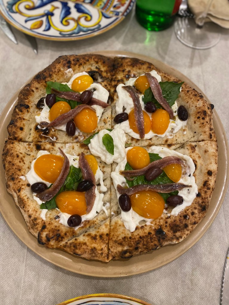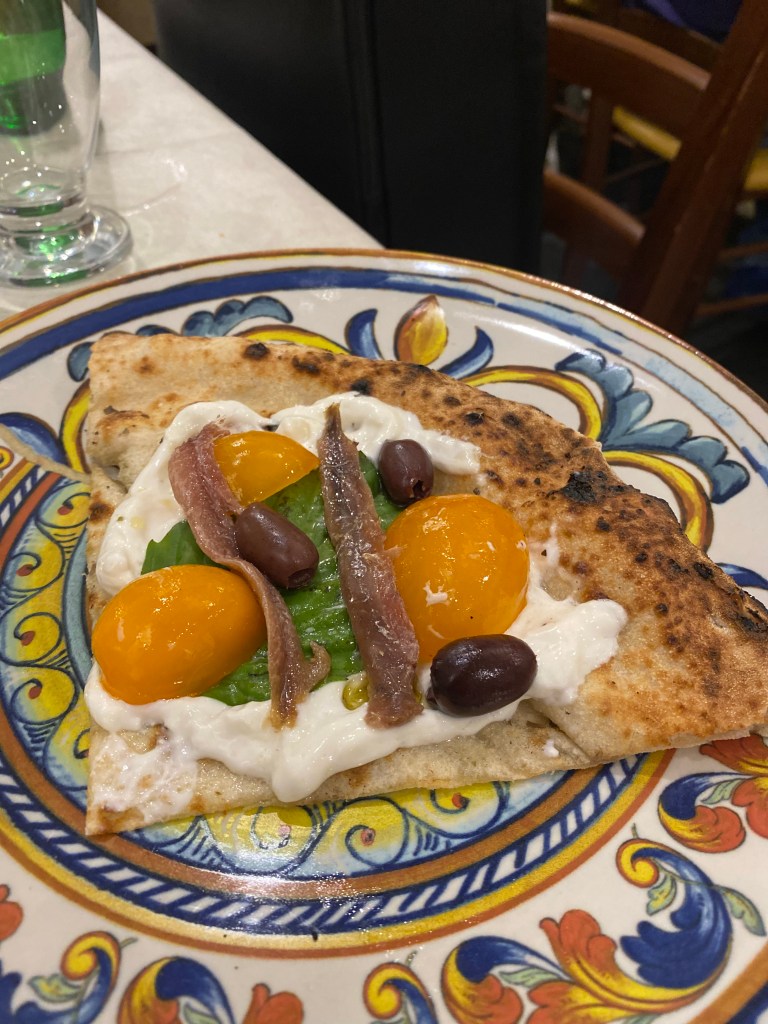 Come un tuffo nell’estate più fresca e languida si presenta la Citara. Base focaccia conciata totalmente all’uscita: stracciata di bufala, pomodorino giallo, filetti di alici, olive nere e origano. Tecnicamente complessa. Realizzazione magistrale per equilibrio, dosaggio e qualità delle materie prime. Il manifesto della bella stagione.