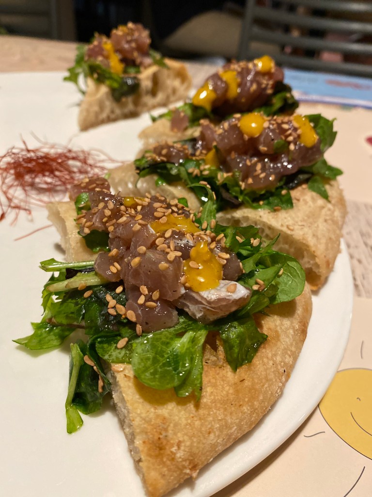 Il padellino è da manuale. Profumoso, croccantello in superficie e morbidoso che accoglie foglie di campo, tartare di tonno pinna gialla, senape al miele e sesamo di Ispica. Evolve nel sapore e nella texture mentre lo mangi. Un incontro così potente tra umami, freschezza e dolcezza su nuvola, antidoto per curare ogni genere di esigenza. Coccola.