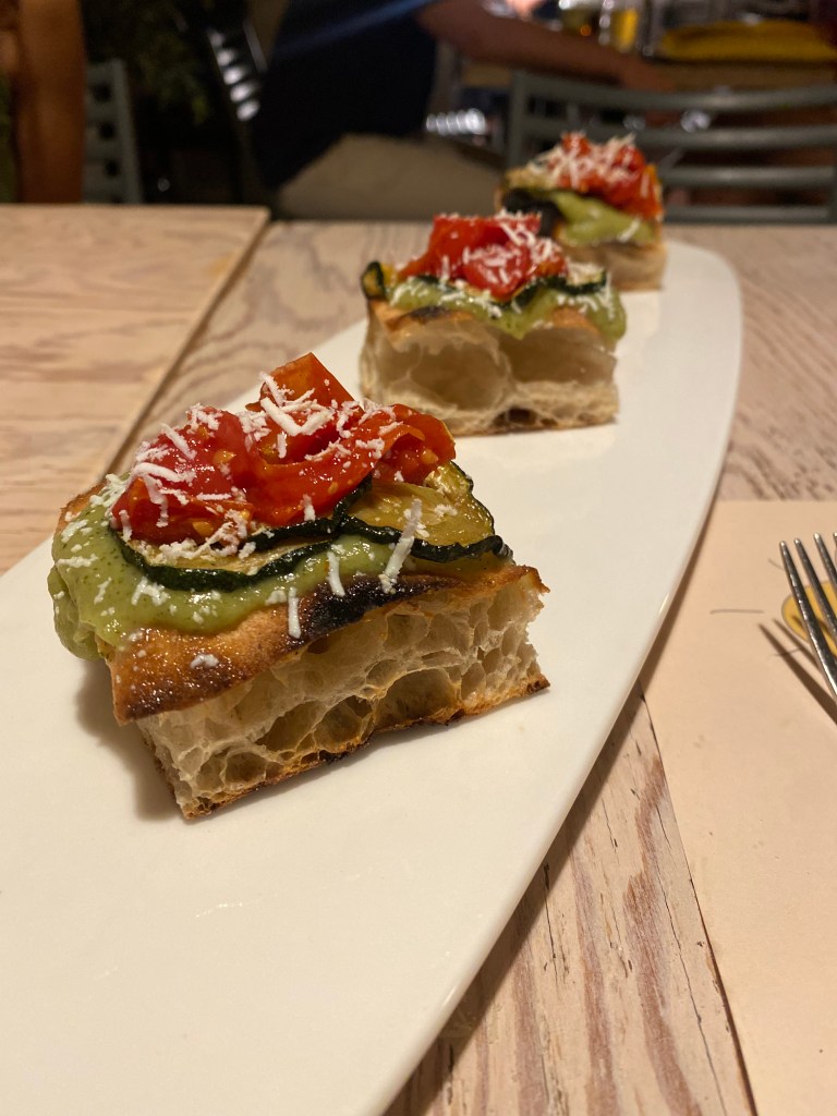 Poi il decalogo della pala perfetta. Croccantezza educata, alta leggerezza e alveolatura sviluppata. Il topping è l’essenza semplice che esalta la materia intima: crema di zucchine, zucchine in purezza, pomodorini confit e ragusano. Crunch siciliano.