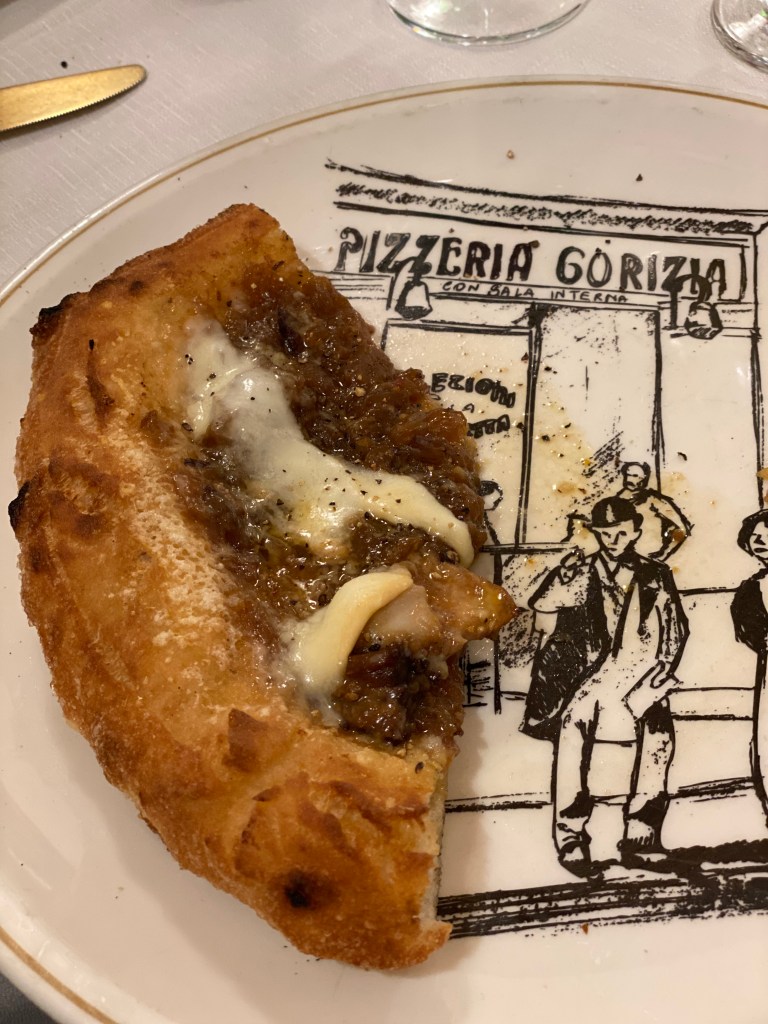 La cucina interviene su pizza. La dea Genovese servita su due palcoscenici, classico e fritta e poi asciugata al forno. Crema spalmabile odorosa di famiglia. Equilibrata, delicata, un arpeggio elegante dove la tenerezza della carne si fonde con la sfacciataggine domata della cipolla. La provola esalta, il pepe macinato all’uscita allunga l’effluvio. Il rumore della sensibilità e del pensiero può essere soave o crunch. Beautifullerie.