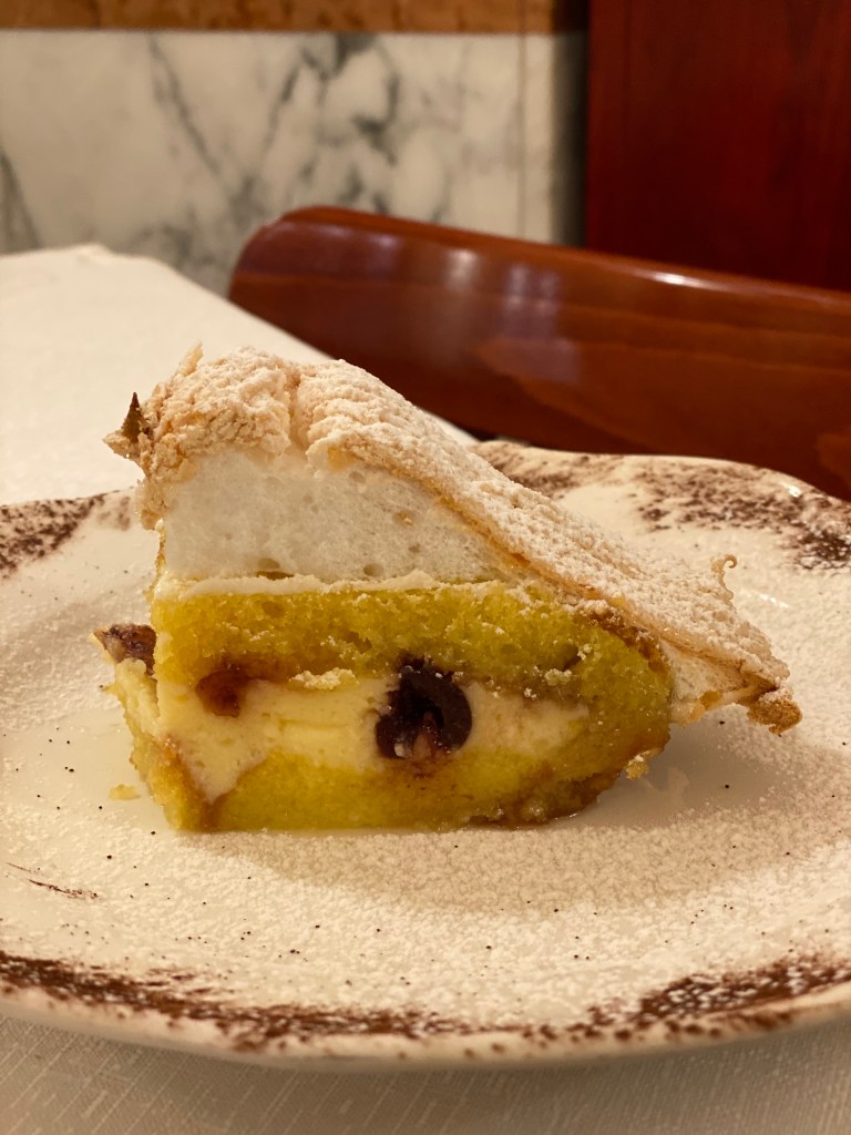 E poi la solita epifania. Il culto massiccio della Zuppa inglese. Un multistrato dal morso ‘shocking’ nella farcia e nelle tinte vintage; il voluttuoso pan di Spagna costellato di mine amarenose; i vortici intrisi di tenerezza e zucchero della bionda meringa. Sia benedetto il duca Pironti, il cuoco ‘Ngiulillo e la sua ricetta vecchia cento anni. Devozione polposa.