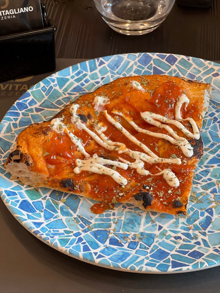 La circonferenza, cotta al millimetro, disarma la storia. Altezze ascetiche per una Marinara fusion a tinte andaluse. Gioco caldo/freddo e aromaticità spinta col pomodoro all’origano e l’Ajo Blanco (zuppa fredda di pane raffermo, mandorle e aglio) saporito e rinfrescante. Evolve nel sapore e nella texture mentre la mangi. Potente con la extra dose di origano del Monte Saro e l’olio all’aglio. Si chiama Marin-ajo e si candida come nuova ossessione!