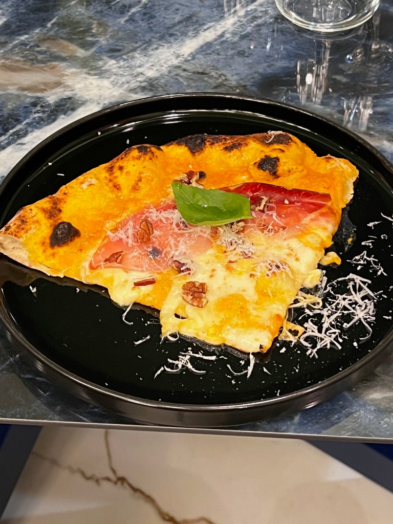 La Montanara, poi, si veste di tradizione napoletana. Pomodorini saltati, grattugiata di cacio e Lardo di Colonnata che si lascia sciogliere con lentezza. Intensa, fedele, per niente unta. Crunch allardiato ricco-mi-ci-ficco, con sapori nostrani pieni di gusto e vitalità. Best simplicity.