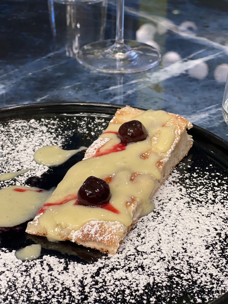 Infine, l’impasto si tuffa nel glucosio liquido e si abbandona alla crema pasticcera e alle amarene. Il fine pasto fa da fiocco perfetto a una degustazione coerente e priva di sbavature.