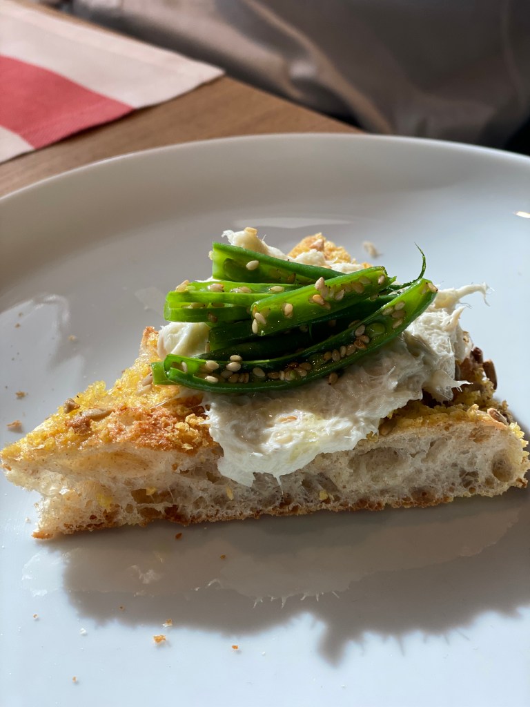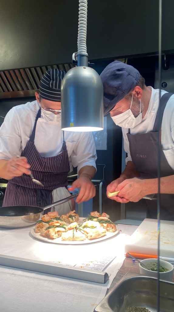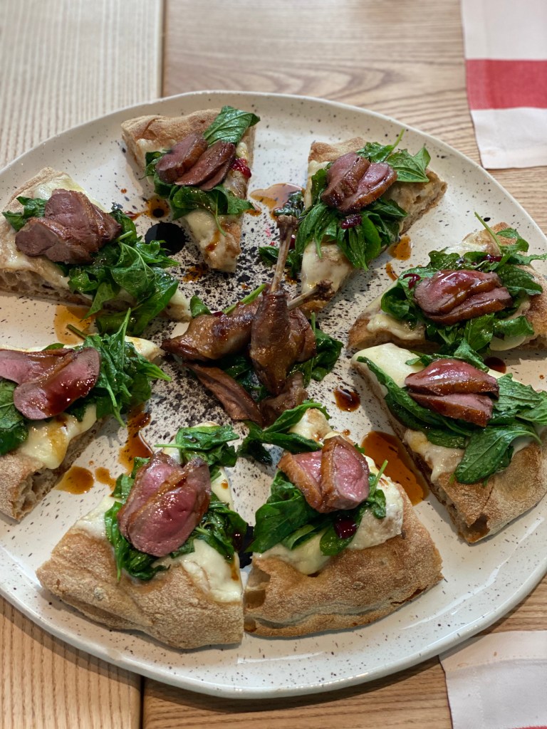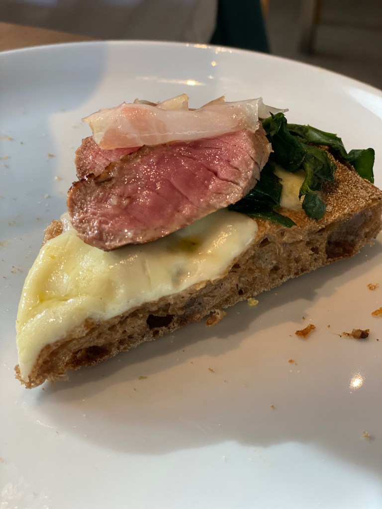 E poi il baccalà mantecato con fagiolini piccanti, la pearà che si focaccia al pepe per accogliere il pulled pork, cime di rapa e kefir di panna e, mamma mia!, il piccione al forno, coscia e fondo, con spinacio selvatico e chutney di marasche. Il jackpot per la memoria insieme ai fine pasto che non abbassano di un millimetro l’altitudine dei sensi.
