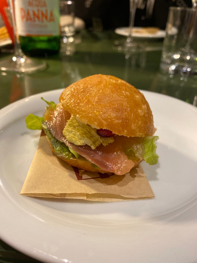 Pastr-amami è un serio imperativo! Proprio un signature dish da ruoto. Armonia complessa ma semplice di comprensione. Ancora colori tra la folla di ingredienti sovversivi bene. C’è pastrami, zucca mantovana, peschiole sotto aceto di vino Asprinio, salsa di acciughe, peperone crusco. Toni e consistenze da equilibrio stellato. Ti pastramo!