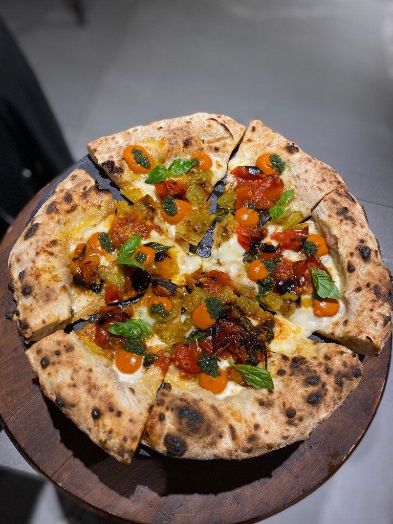 La Margherita Bruciata è pura vanità a colori… Piennolo giallo e rosso del Vesuvio e pomodoro verde dell’Agro Sarnese bruciato al forno a legna, coulis, fiordilatte e caviale al basilico. Eduardiana. Purezza di gusto con cremosità da confort zone e confort food. Magnetica.