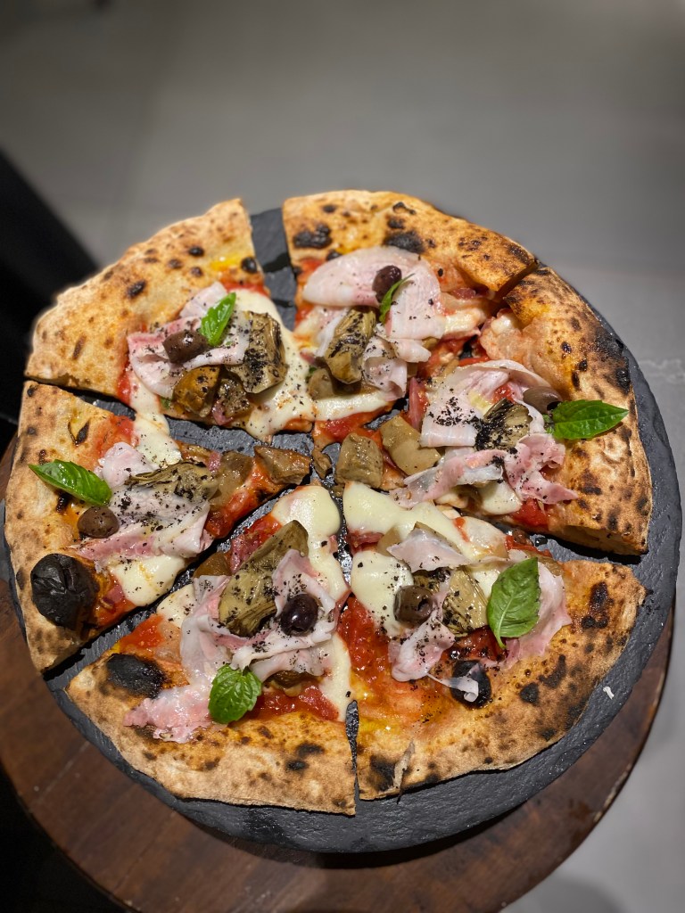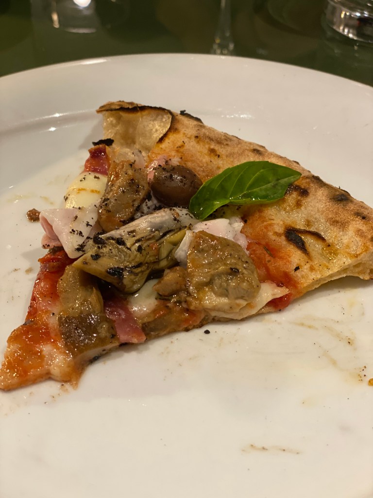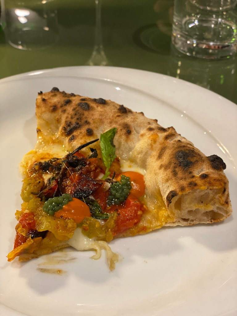 La Capricciosa secondo Roberta è scritta in versi. La mia idea di Empireo. Pura eleganza di contenuti e spinte coraggiose. Al salame fa compagnia la pancetta di maialino Nero Casertano affinata al miele, olive caiazzane in doppia consistenza, carciofini alla brace che donano fumé e porcini trifolati che giocano di consistenza e annaffiano con umami liquido. Egregia.