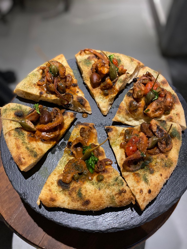 I polipetti alla Luciana su montanara fritta e infornata poi raccontano le storie di un mare piacione e avvolgente da appeal familiare. La stessa con Genovese e provolone impiccato ammalia senza pudore alcuno.