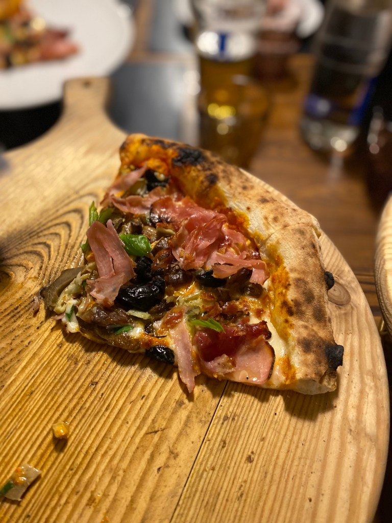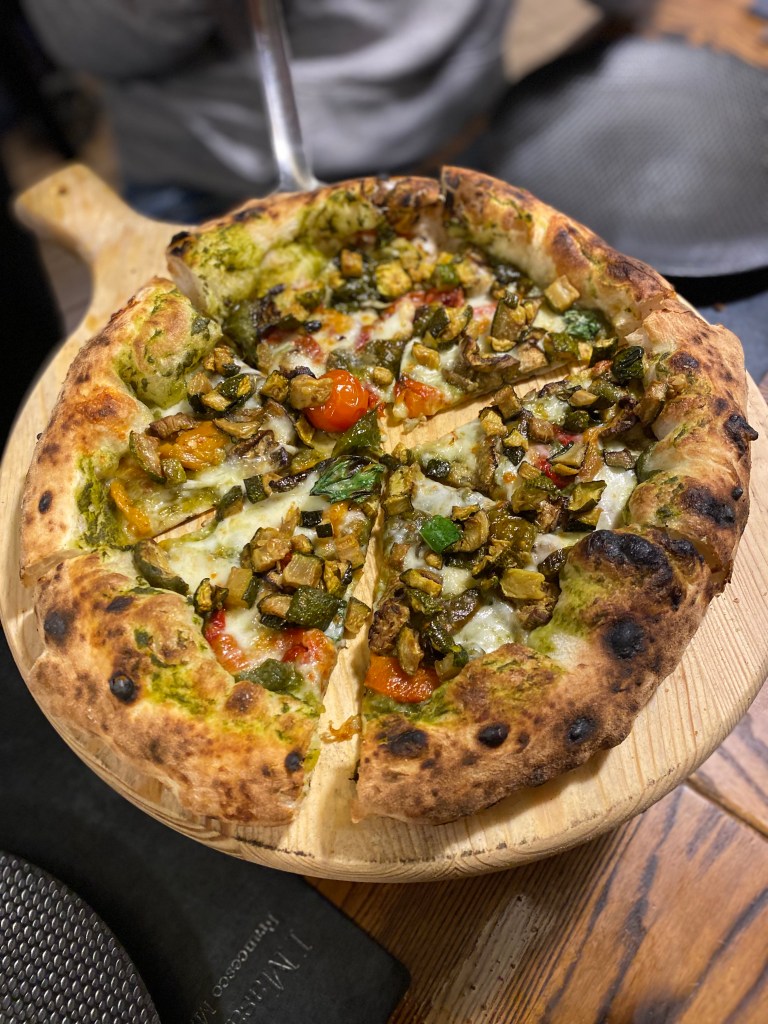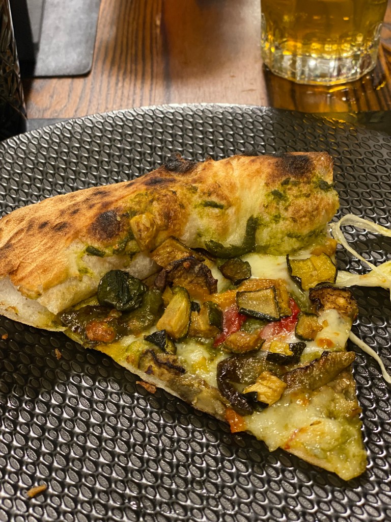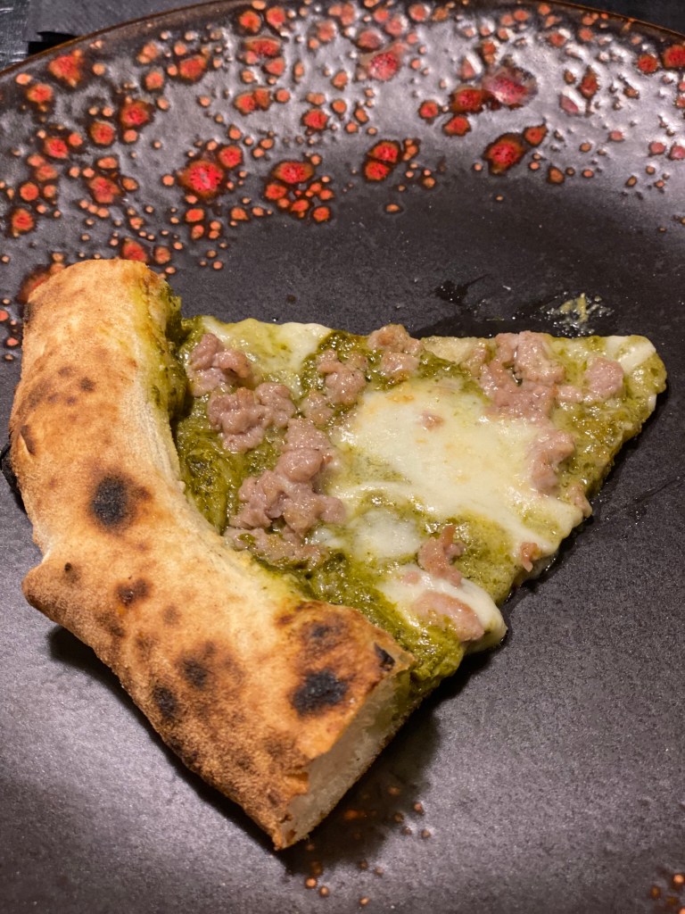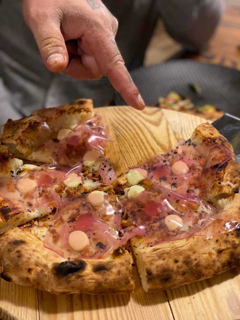 L’Ortolana si fa Atomica, il disegno del futuro sfumato con pennellate del passato. Consistenze e sensazioni e tutto l’orto presente, senza essere timido. Crema di cicoria saltata, melanzane arrosto marinate, peperoni arrosto, peperoncino friggitello, zucchine marinate. Come una ratatouille lunghissima dai tratti vangoghiani. Rurale.