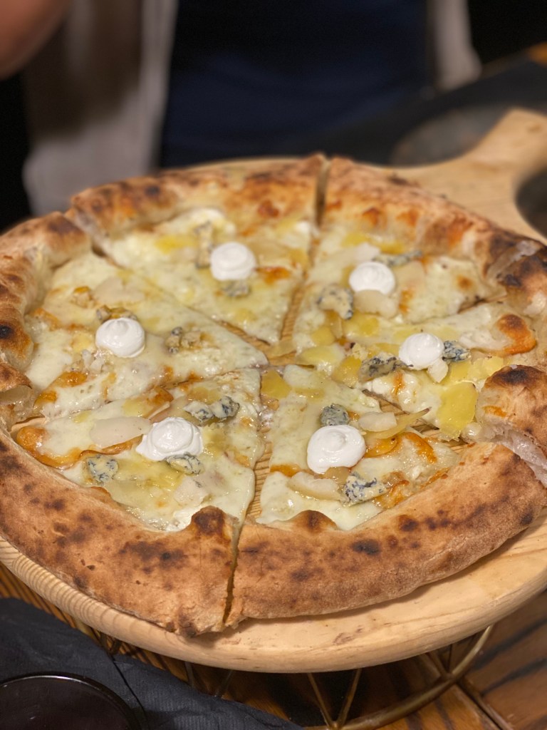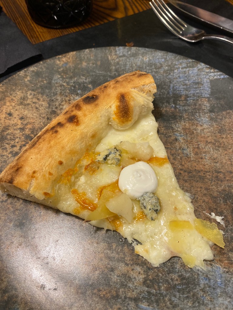 Riscrivere. Anche questo è il tema. Dimensione avanzata con quell’alfabeto di segni tutti suoi. Fiordilatte, caciocavallo affumicato, feta bio; Brie de Meaux, scaglie di cheddar Westcombe, scaglie di Emmentaler AOP Svizzera, crema di bufala, erborinato affinato all’arancia, passito di Pantelleria. Formaggi Eccetera. 7 protagonisti anche qui. Visione, forza e tecnica domata. Fuori spazio, fuori tempo, fuori dai radar e io fuori di testa.