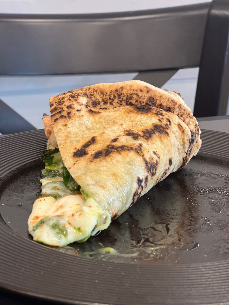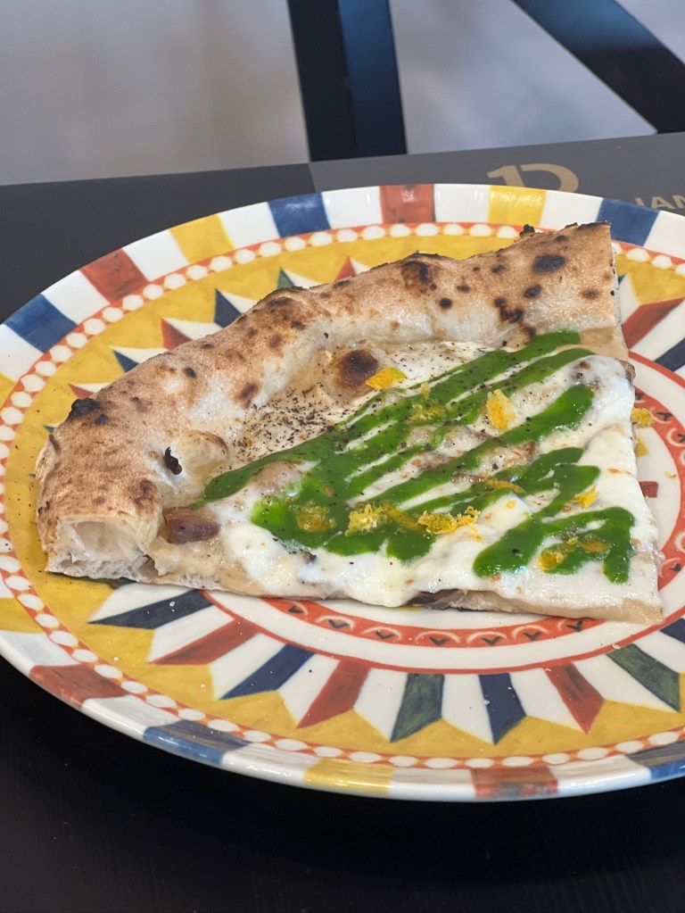 La croccante nasce con l’andatura vincente. Quel diavolo di Diego la rende conturbante. Riduzione di Piennolo arrostito, pesto di basilico, crema di ‘nduja, ricotta salata a scaglie e peperone crusco. Cremosità spinta, crunch delicato. Toni su toni. Tostature, piccantezza, sapore. Una pizza lunghissima, calda. Magma flegreo.