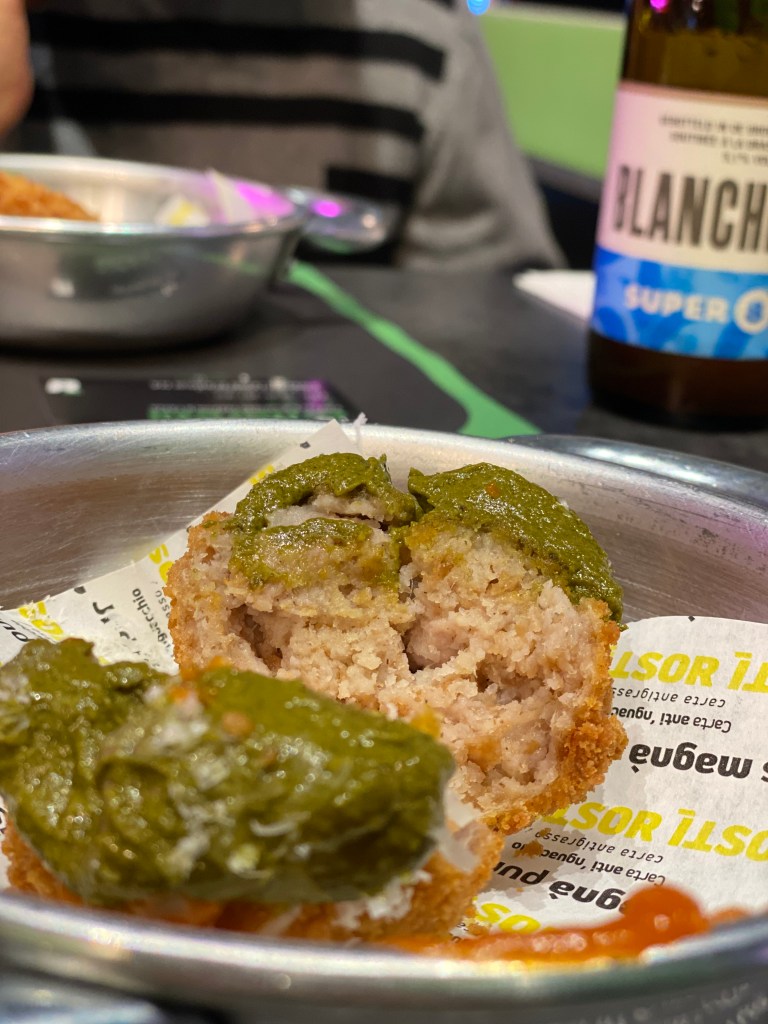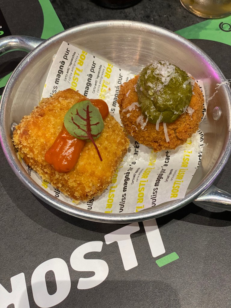 Un Illuminato che cerca la precisione maniacale nel fritto, fritto a momento (sempre) e panato con un blend di tre cereali disidratati. La Mozzarella in carrozza è un atto d’amore, la gastro-criminalità al servizio della tradizione: oro che scrocchia e fila, fila e scrocchia, con il ketchup di peperone arrostito alla napoletana in agrodolce che evolve in aromaticità costante dove ci inzuppi il cuore. E per i polpettomani, quella di salsiccia, con emulsione di friarielli e caciocavallo irpino, è la dose significante e divertente di istinto e sapore. Fried for future!
