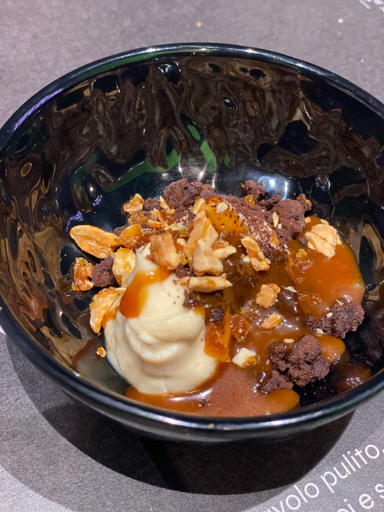 È una continua montagna russa qui con la possibilità di zigzagare tra fine pasto golosissimi dalla manifattura complessa e creativa. Matteo non abbassa mai il livello tra giocabilità e godibilità. Si affonda il cucchiaio col sorriso nel RostiMisù con brownies al cioccolato fondente, mousse di mascarpone e spuma di zabaione o nel mix di Arachidi e Caramello dai toni proustiani. Psichedelici.