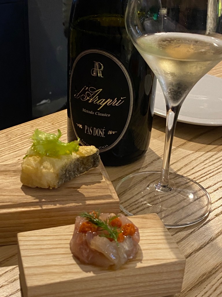 Cavalco il flusso di baldanze rituali e simposi mistici. Entrée eclettico, policromatico, filarmonico. Bocconcino di baccalà, tartare di ricciola con mousse di pomodoro secco, bon bon di riso. Divertisment.