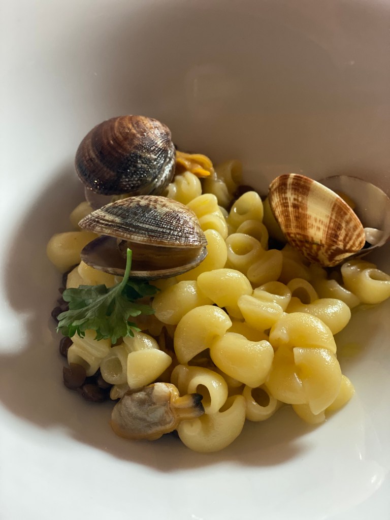 Poi il risotto ai gamberi avvolto da aurea struggente fa da apripista all’architettura mozzafiato di una composizione che lascia il ricordo: chiocciole con vongole e lenticchia. La grazia del formato di pasta, l’umami marino e l’aromaticità del legume dalla tendenza amara finale. Brezze serafiche e familiari. Nessun imperativo all’infuori del piacere.