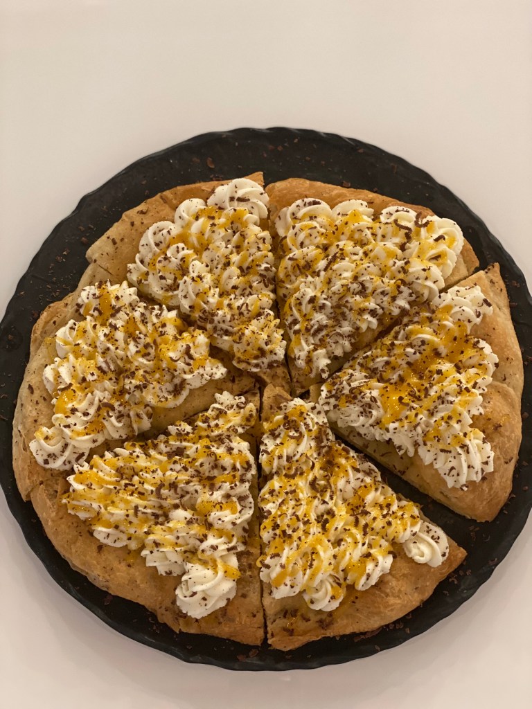 La sua ultima sweet si ispessisce di padellino fritto e al forno e ti avvinghia con ricotta di pecora, confettura di arancia candita e scaglie di cioccolato fondente. Grembo rassicurante che alleggerisce da ogni elucubrazione mentale. Acrobazia scapigliata e festosa.