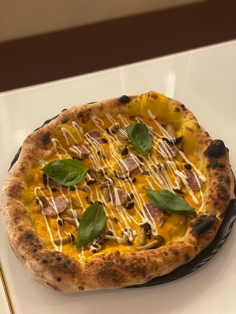 La Pizza della nonna vira sulle morbidezze accentuate. Per i zuccalovers un viaggio nell’Empireo. Pioppini, cotechino di maiale nero casertano e fonduta di provola ad allungare la danza della vellutata arancione. PumpkinG!