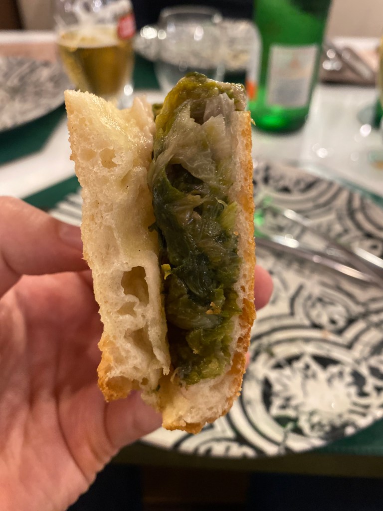 L’entrée da comfort zone che accomoda il palato al percorso. Frittatina classica con cuore di ragù e Baciata ripiena di scarola ripassata, olive, capperi e colatura di alici. Comfort food, comfort people! Un bacio ancestrale puntellato da sentimenti ancora vivi. Mai dismettere certi saperi.