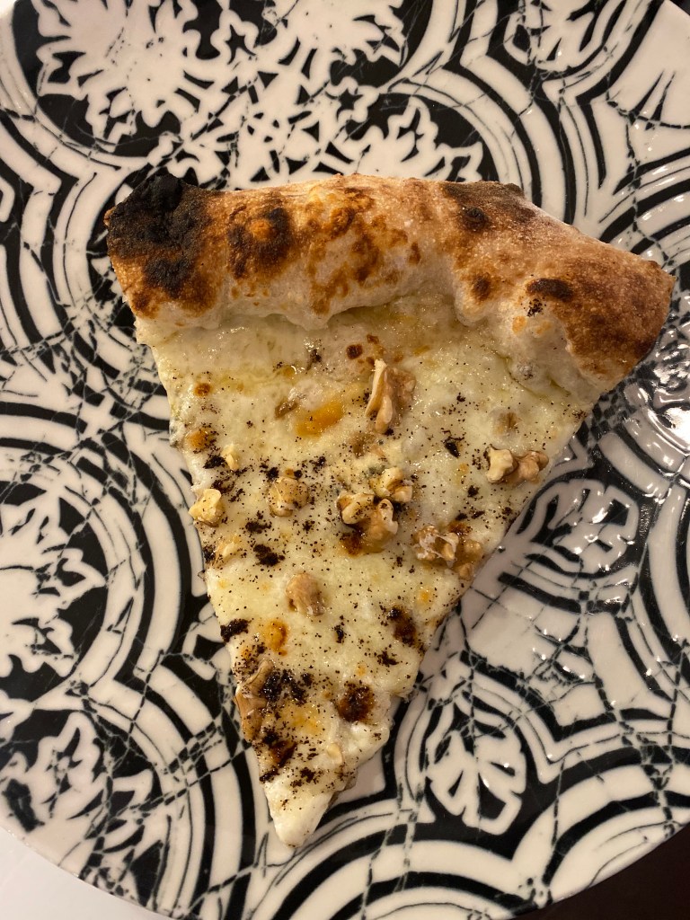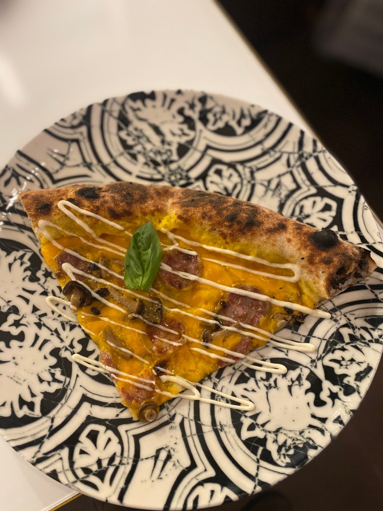 Cremosità solida, bucolica dai tratti vangoghiani la Pizza patate e tartufo. Il sugo di pasta e patate nella sua veste più schietta e verace vizia la forma, la provola affumicata spinge e il tartufo nero bagnolese amalgama gli effluvi. L’impasto si concede senza esitazione per una persistenza iper-godereccia. Una carezza in un pugno.