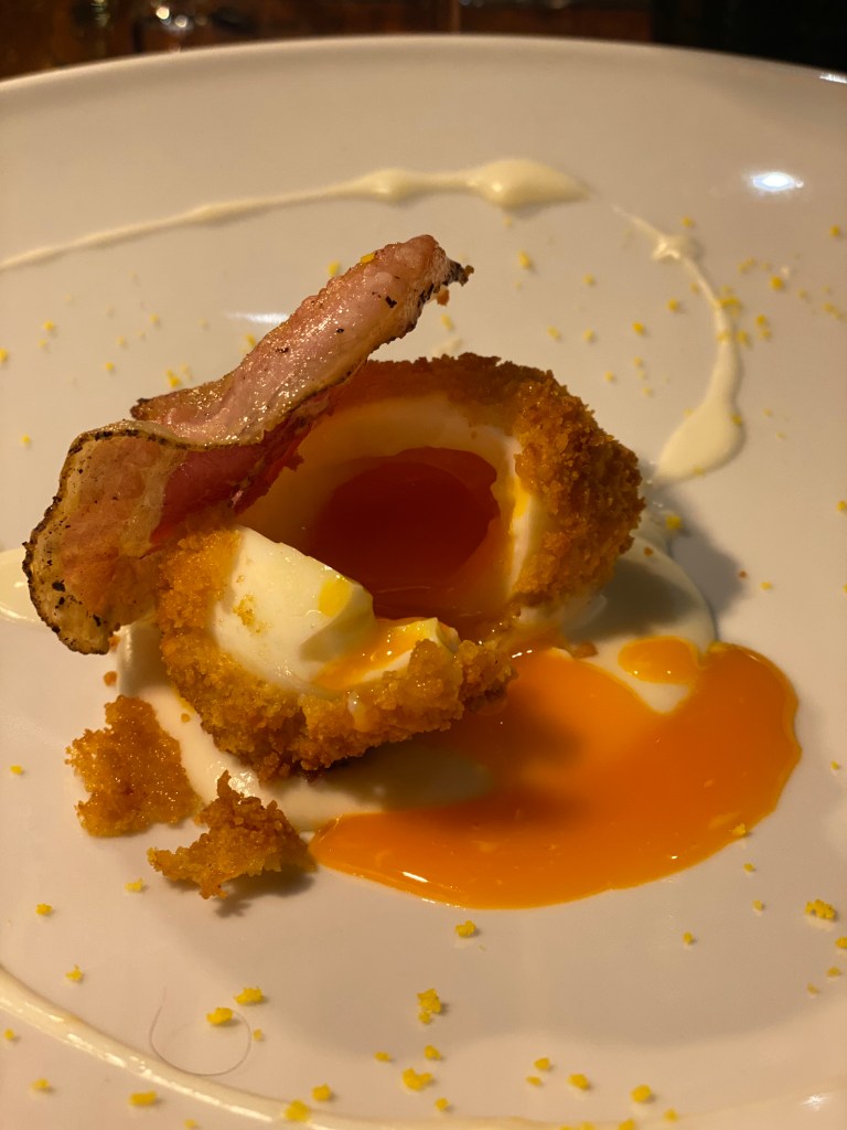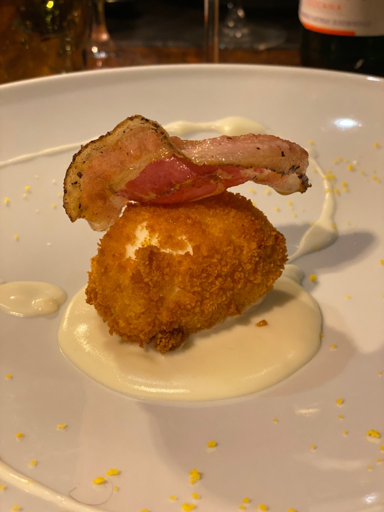 Uovo Powered in carbonara. L’uovo Bio razza livornese, diventa poche, in crosta di grano, con la camicia di albume solidificata che ingloba il tuorlo liquido, servito con pancetta croccante, fonduta di pecorino. Presentatemi la gallina, autocit.!