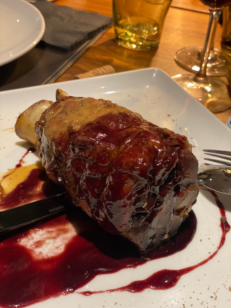 Poi la visione di certi prodigi gastro criminali: sentirsi Fred Flintstone, fare gli occhi a brontosauro e gridare “Yabba Dabba Doo!”. No, non si tratta di tomahawk, eppure la clava c’è tutta: Stinco di maiale nero al forno, riduzione di Montefalco rosso e scalogno caramellato. Un bagno di sensi!