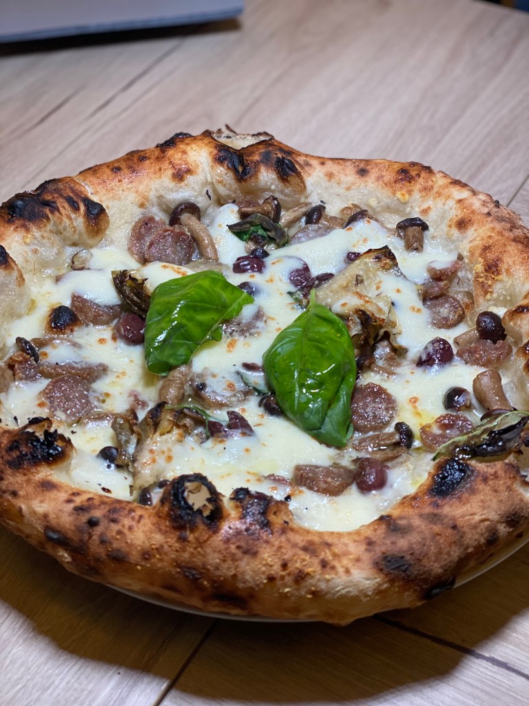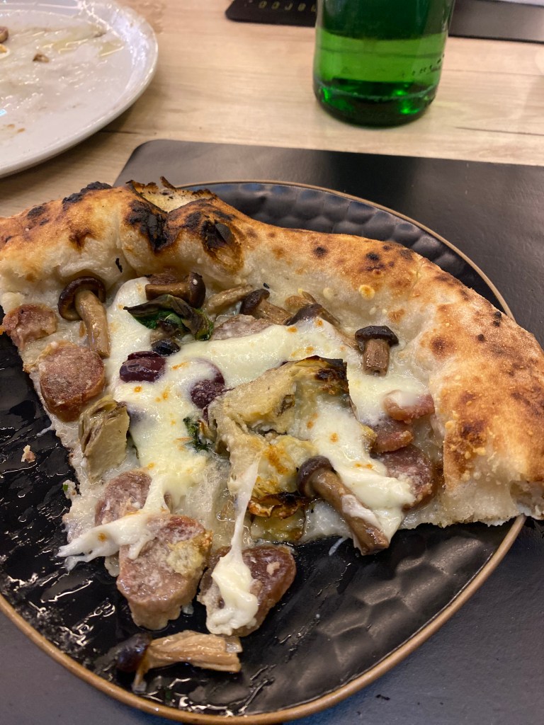 E il menù sorprende per la carta delle Capricciose. Devo confessare al mondo il mio amore morboso per ogni tipo di variante fatta bene. La sua Capricciosa Bianca gioca oltre regione con salsiccia passita veneta piccante, funghi chiodini freschi, provola dei Monti Lattari, olive taggiasche e carpaccio di carciofi. Umami, consistenze, suoni forti e decisi. Sisi, è piacionissima!
