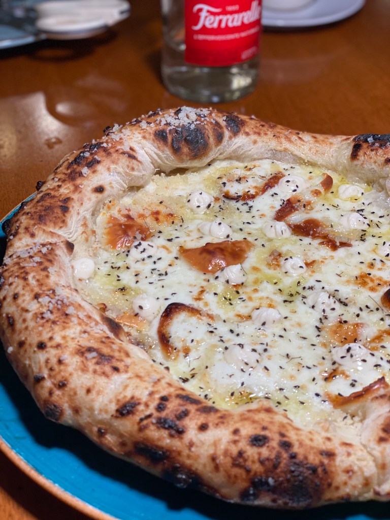 E la 4 caciocavalli e anice nero glorifica l’arte delle radici di un pizzaiolo pastore. Nessun imperativo all’infuori del piacere. Le diverse stagionature ammaliano tra profumi, giochi e consistenze. La spezia ride vanigliata e dolciastra. Psichedelica.