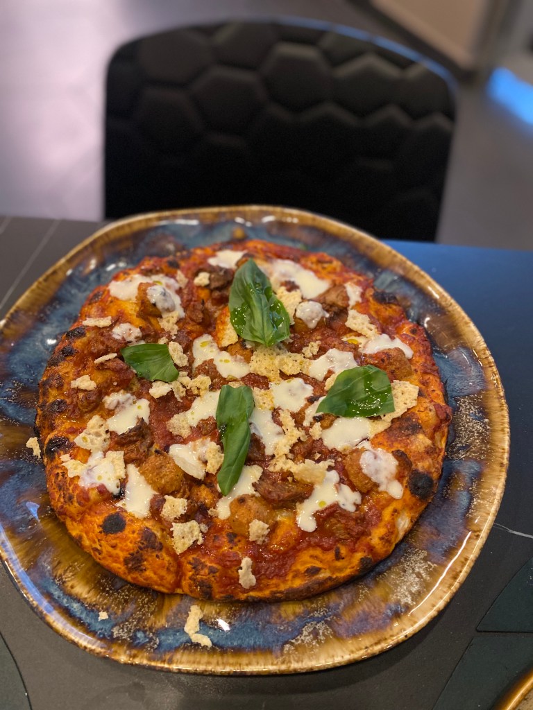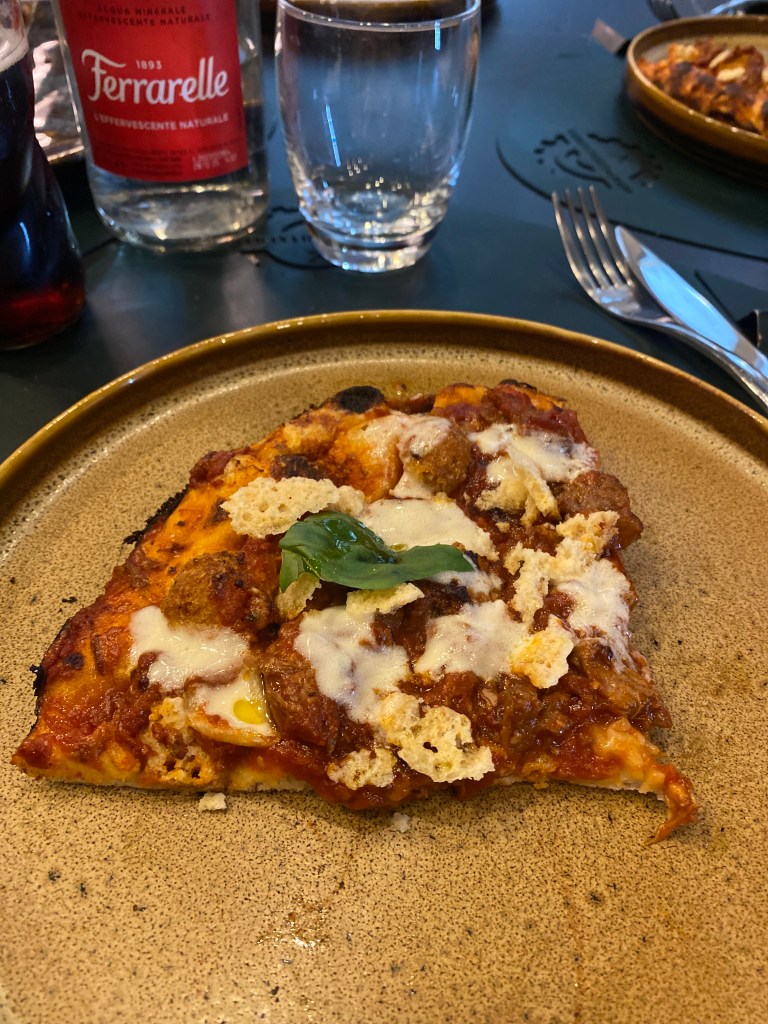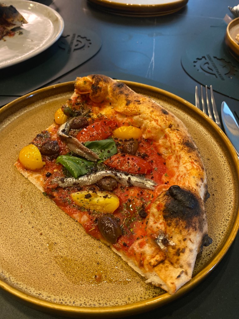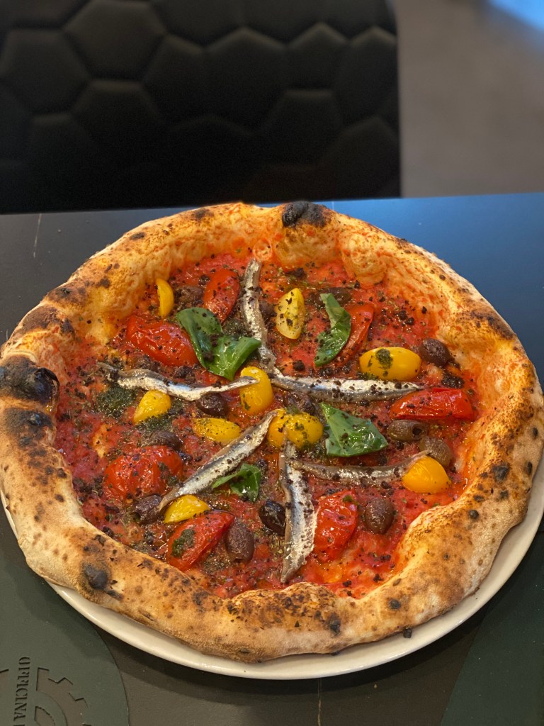 Col piglio pacato di chi non ha nulla da dimostrare, passa all’estetica contemporaneo-style con rivisitazione storica. Marinara alla Mario, ça va sans dire. San Marzano, aglio orsino, pomodorini gialli del Piennolo del Vesuvio, alici di Cetara, olive nere, basilico. Un mix di suggestioni di storia moderna. Cremosità, aromaticità, morso lungo con l’impasto che coesiste col topping senza svanire. Non un rimestamento schizofrenico delle carte. All’altezza.