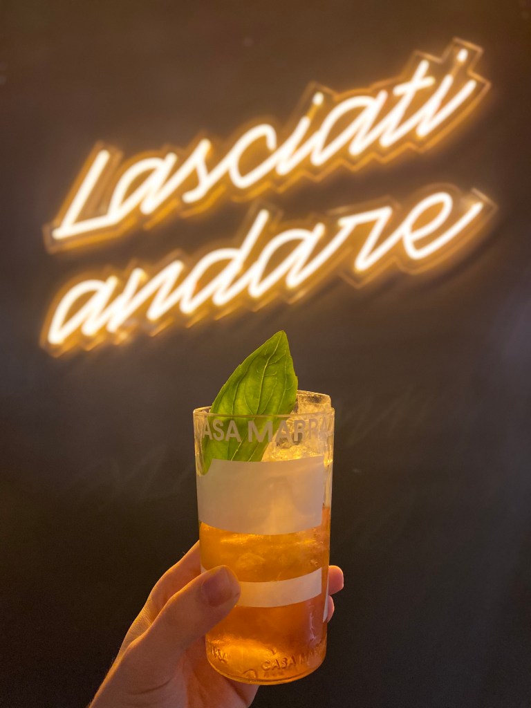Un bancone che gira dintorno, vivo, ordinato subbuglio di bartender e collaboratori di sala che coccolano meglio di una spa. E poi quell’invito che sbrilluccica, vestito di giallo, che sa di bello, di filosofia di vita, di totale abbandono in mani rassicuranti. “Lasciati andare”, la felicità.