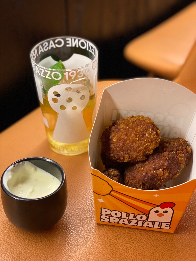 Superbi gli spiedini di Polpo e patate laccati con spezie. Benessere battagliero. London Calling, per soddisfare il mio immaturo bisogno dolce, con Gin Bombay Premier Cru, sherry Tio Pepe Palomino Fino, succo di limone, zucchero e Angostura Orange. Mio prefe.