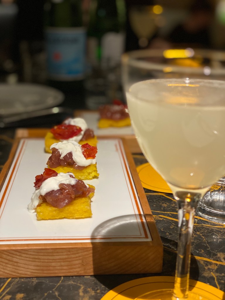 L’euforia liquida ritorna con il Death in the afternoon, Riesling Alsace Dopff & Irion, assenzio La Fée, Angostura Orange. Alchimia tra spinta acida e aromaticità che esalta certi giochi enigmatici: tendenza dolce della Tartare di manzo che si sente Tonnata o del Pane, pomodoro e (carpaccio di) scottona (selezione Baraonda).