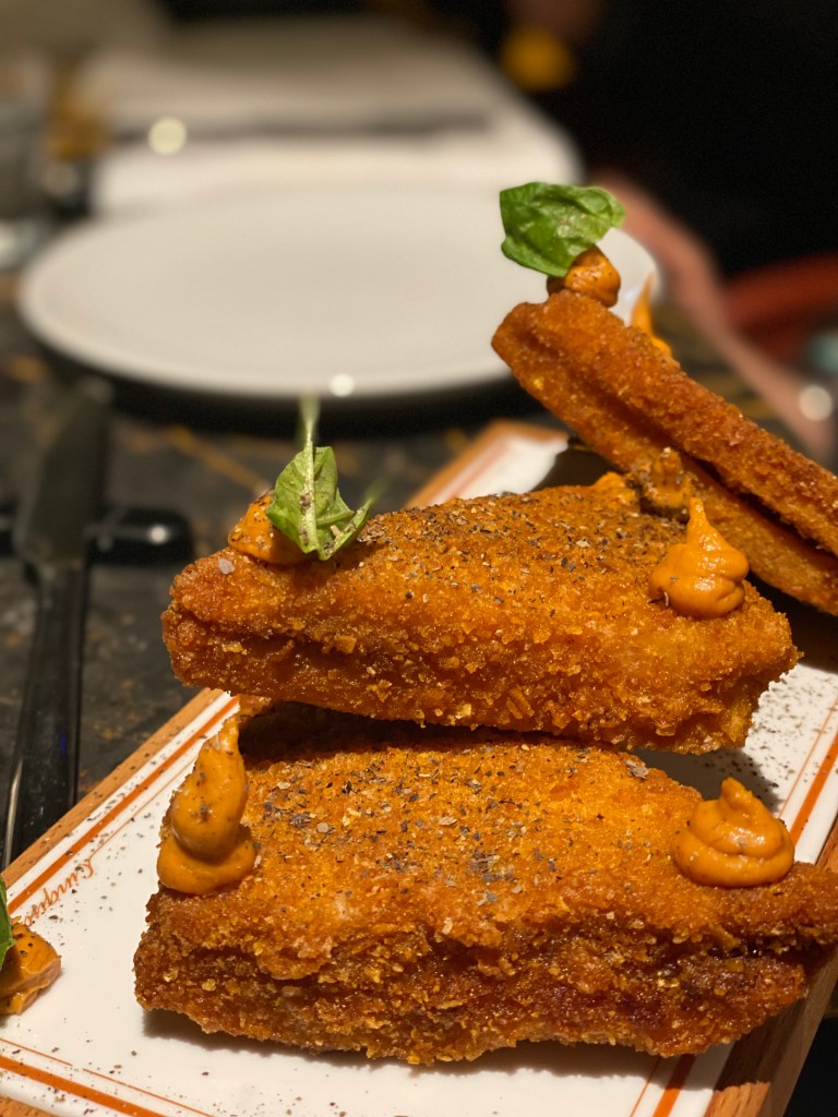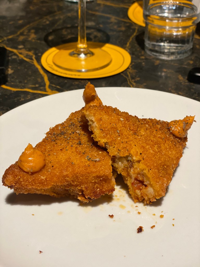 Poi una corsa di rivisitazioni pirotecniche dal calibro imperante. Crispy nice, chips allo zafferano con tartare di tonno, stracciatella e pomodorino semisecco. Un gianduiotto dalle geometrie meneghine. Riccanza ingorda e goduriosa per la Parmigiana in carrozza, un signature dish per Ale. Mousse e straccetti con provola di parmigiana, custoditi in pane in cassetta panato e fritto. Empireo crunchoso e giravolte palatali. Fotonica.