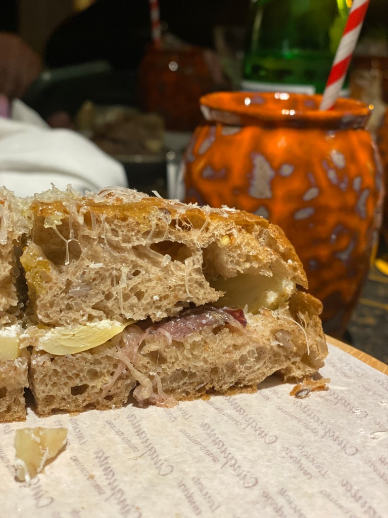Una sorta di beatitudine territoriale il Paganese, multi cereali ripieno di carciofo (infornato, semisecco e messo in conserva), primosale leggermente stagionato e pancetta di Rubia Gallega (selezione Baraonda). Lodevole.