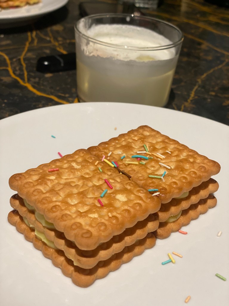 Per dessert un’arcaica novella paesana, la Pizza di Gallette al Limoncello Nazionale che glorifica il lessico familiare nella sua accezione più nobile. Delizia al Limone liquida (Gin Bombay, Limoncello Nazionale, liquore al cacao bianco e panna fresca) eppure 4D. Rapito.
