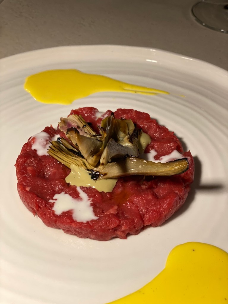 Stop!, show-cooking. Davide, ammaliatore, massaggia con sale e olio il trito di manzetta; tocco di stagionalità con carciofini grigliati sott’olio e tre spinte di zing: maionese di capperi, cremoso al tuorlo e salsa di pecorino bagnolese. Tartare da lode.