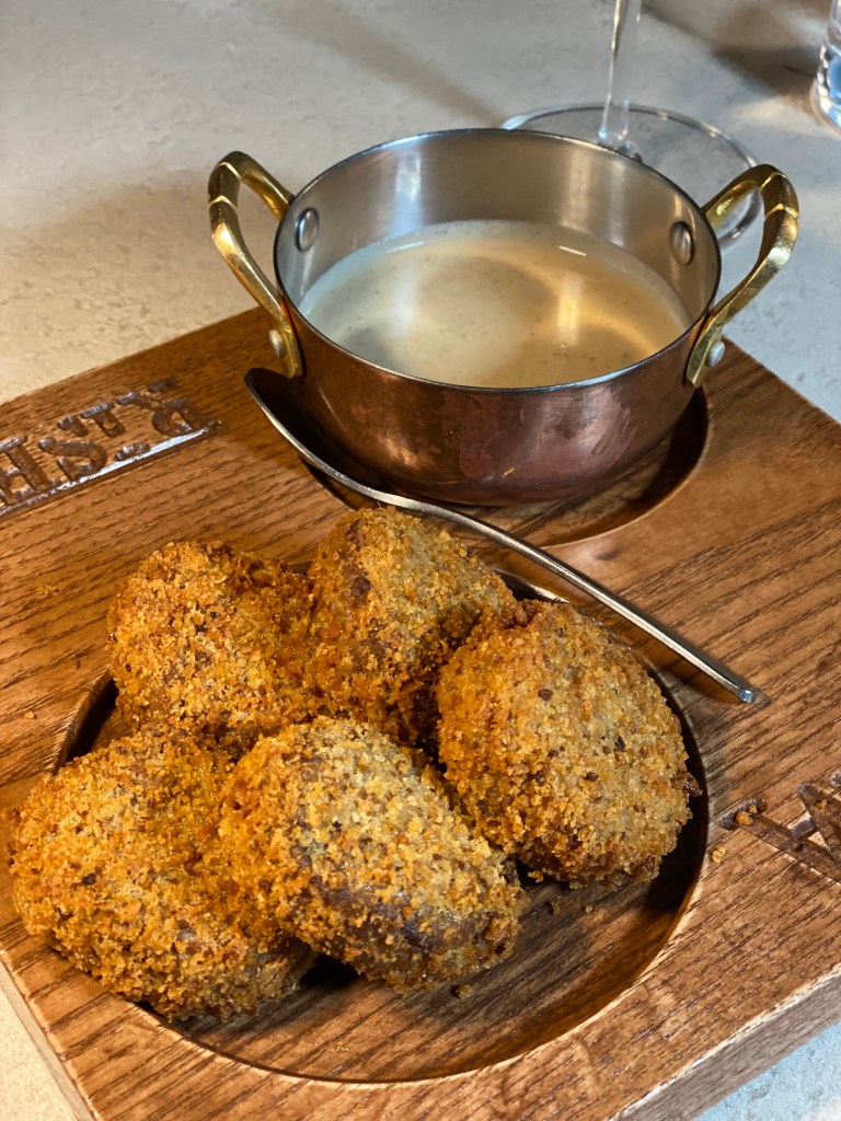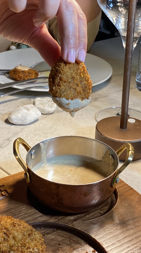 Un tuffo romano nella salsa alla gricia per le polpette di bollito. Crosta croccante e cuore morbido, pepite dorate che trovano il vestito migliore nella pucciata saporita obbligata. 3D.