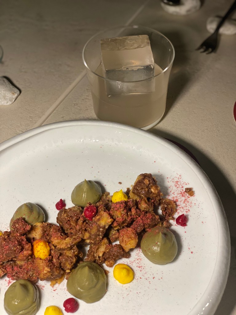 Croccante di cioccolato gianduia con cremoso di pistacchio e lamponi in più consistenze innaffiato col Ron Coco (rum aromatizzato al cioccolato ruby, cordiale di fragola e banana, latte di cocco) di Martino Ascione e la conferma di un posto che ti sta a cuore, nel cuore, ovvero dentro, per così dire incastrato dove non c’è chiasso, maschera, finzione.