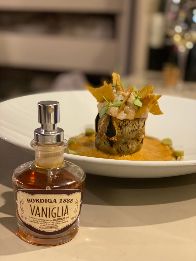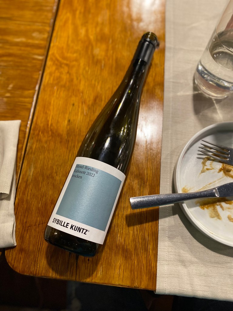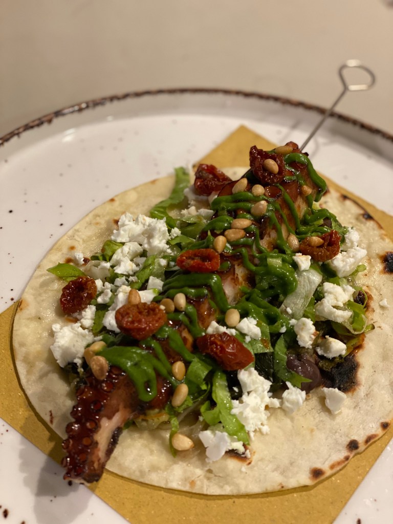 Il carciofo si abbandona alle diverse consistenze, si pompa di scampi e battuto di aglio e prezzemolo e indossa due gocce di vaniglia. Immorale trascendenza. Il polpo sguazza nella scarola three-faces (stufata, croccante e liquida), vivida di pomodorini semidry e feta, e si arrotola nel pane naan. Sì sì, un kebab nel bel mezzo del luna park. Apoteosi. Mettici, in questo calderone, la testa-dura aromatica del Riesling Kabinett Trocken 2022 – Sybille Kuntz e capisci il ruolo del sommelier.