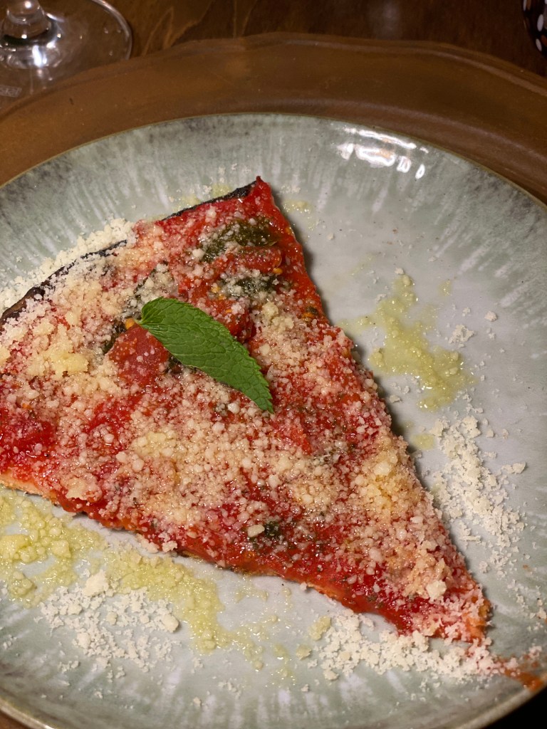 La prima slice è la fusion perfetta! La romana sottile, croccante, dal bordo bruciacchiato, sposa Quel matto di Luca, Cornacchia certo!, signature dish della casa, topping manifesto di Margherita d’Abruzzo. Come una pappa al pomodoro: pomodoro Pera d’Abruzzo stracciato a mano e macerato con menta, timo, cipolla e misticanza, crema di fiordilatte, crema di basilico e grandinata di pecorino di Farindola. Come il Paradiso ma non all’improvviso, delizia matura e consapevole di sentori nitidi che stendono i sensi. Matrimoni felici. (In abbinamento Colleberdo Trebbiano d’Abruzzo Superione DOC 2022 – Cingilia)