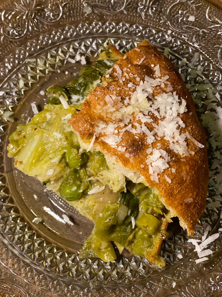 A Roma è l’ora della Vignarola. Pezzetta mette la primavera nel padellino di Cornacchia che si fa sandwich per abbracciare piselli freschi, carciofi spadellati, fave sgusciate e asparagi selvatici. Morso ruffiano, crunch piacione e cremosità golosa. Green power! (In abbinamento Pinot Nero Terre dell’Aquila ‘Diamante Nero’ IGT 2019 – Castelsimoni)