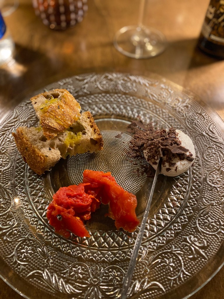 Ghisa, morbida smoked stout prodotta da Birrificio Lambrate dai sentori di caffè e cacao, e pane (di Pezzetta) con ricotta, cioccolato, zucchero, olio e pomodoro (di Cornacchia) come fine pasto coraggioso di un percorso lineare dove la condivisione lascia la gioia in bocca.