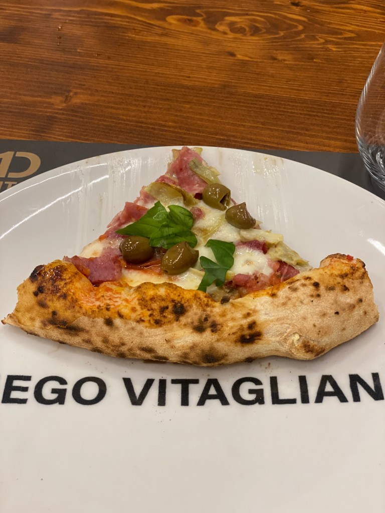 Capricciosa senza capricci: pomodoro San Marzano, fiordilatte di Napoli, Grana Padano, spalla cotta di maiale tranquillo, salame di suino dei campi Flegrei, olive taggiasche, carciofi in umido, funghi misti, basilico. Armonia e fascino si uniscono alla cottura perfetta. Una trama ammaliante e vanitosa con gli ingredienti che fanno da coro al disco di pasta da cineteca per profumo e struttura.